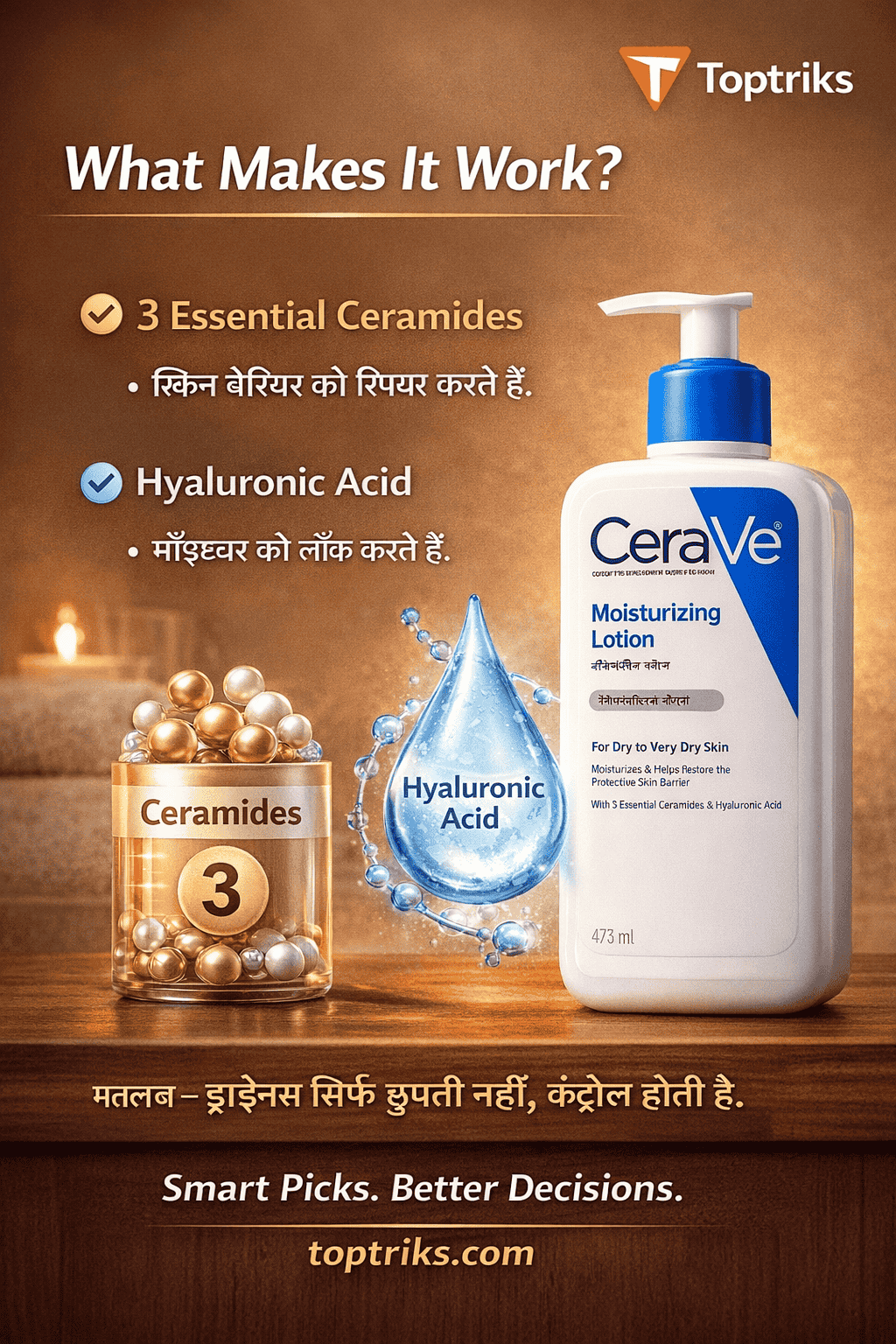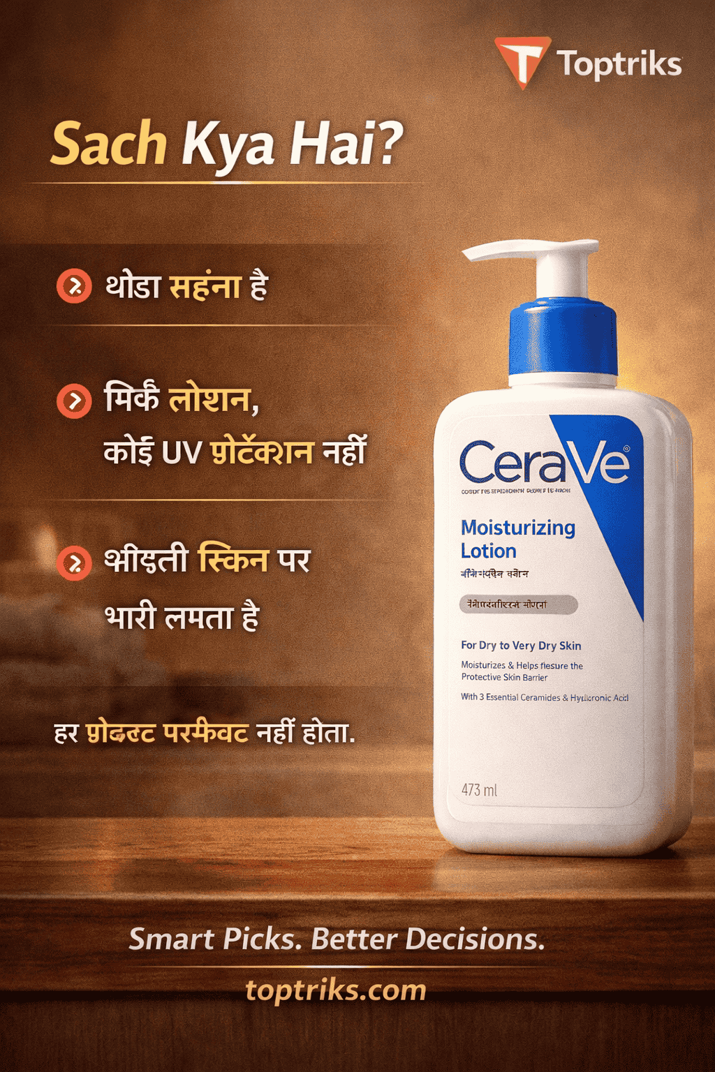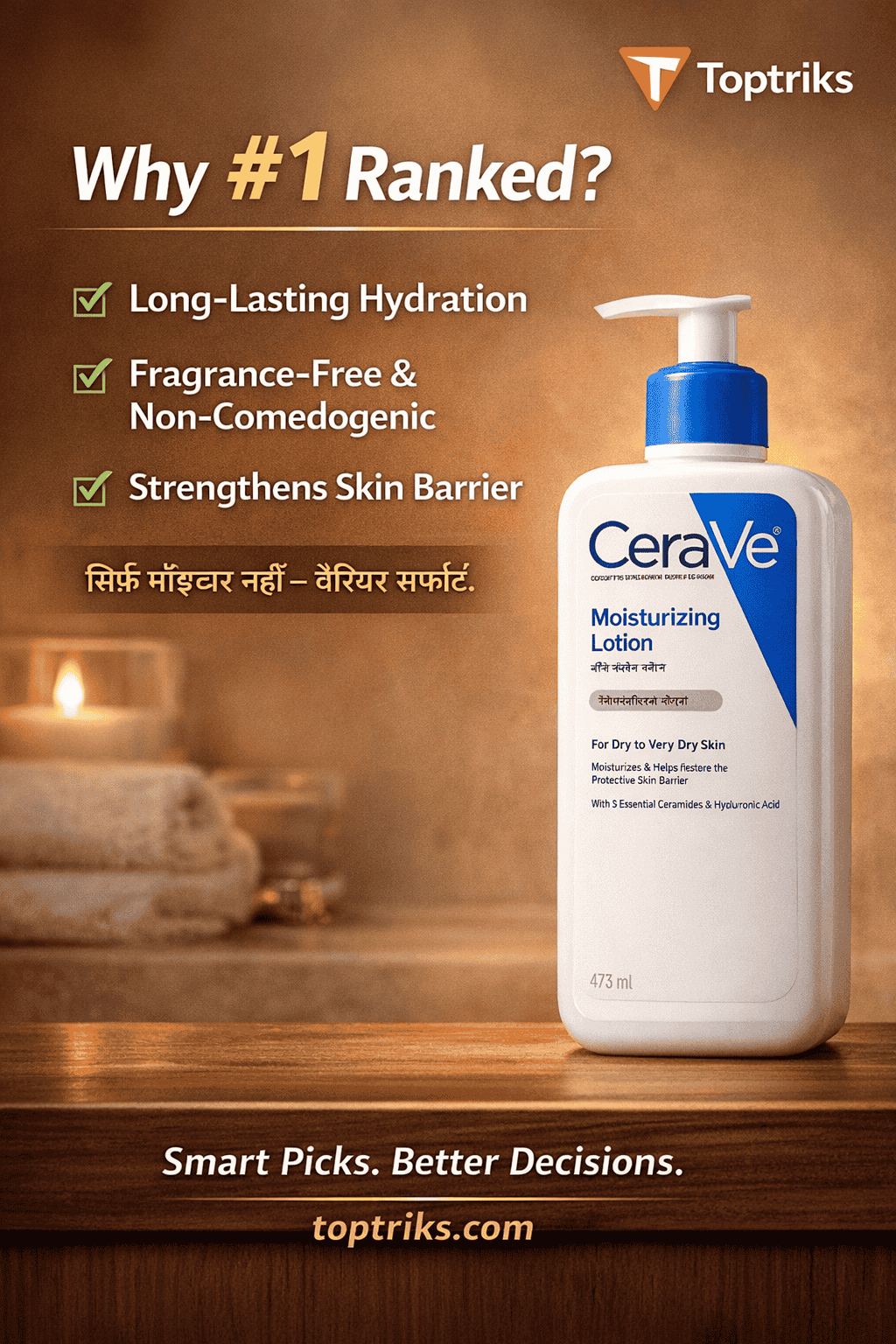 यह है Toptriks पर #1 रैंक किया गया बॉडी लोशन। अगर आपकी स्किन ड्राई या सेंसिटिव रहती है… तो ये वीडियो आपके लिए है। मिलिए CeraVe Moisturizing Lotion से — जो देता है डीप हाइड्रेशन और स्किन बैरियर सपोर्ट।